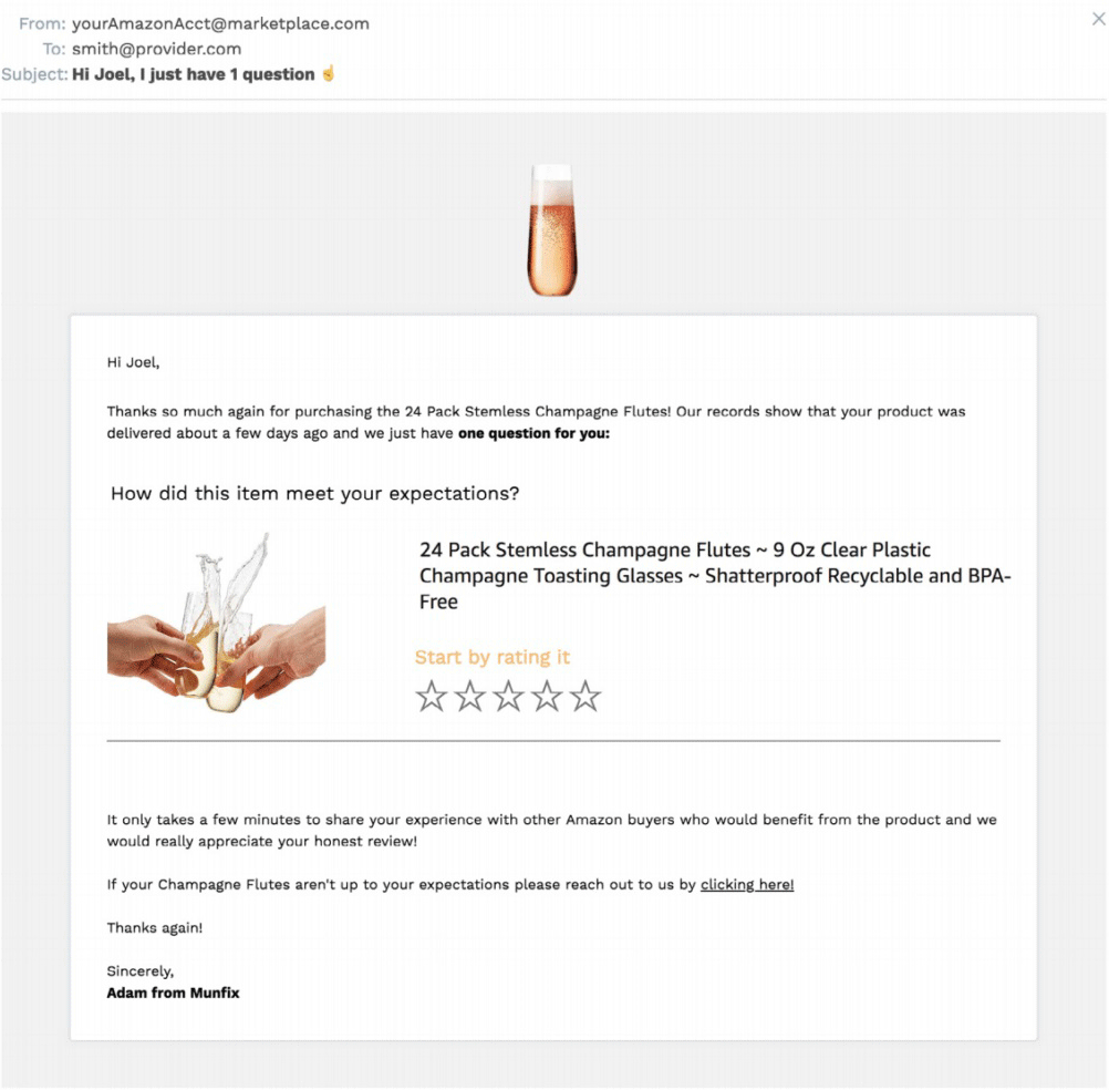 You can proactively encourage customers to share their experiences through follow-up emails. Amazon calls it Buyer-Seller’ Messaging,’ but your review request will land in your customer’s email inbox.