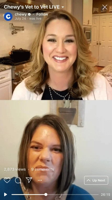Instagram also allows you to live-stream videos. This feature can be super effective for encouraging audience interaction. You can host live events, hold Q&A sessions, and more. For example, the pet food eCommerce brand Chewy often uses Instagram Live posts for expert interviews and Q&A sessions.