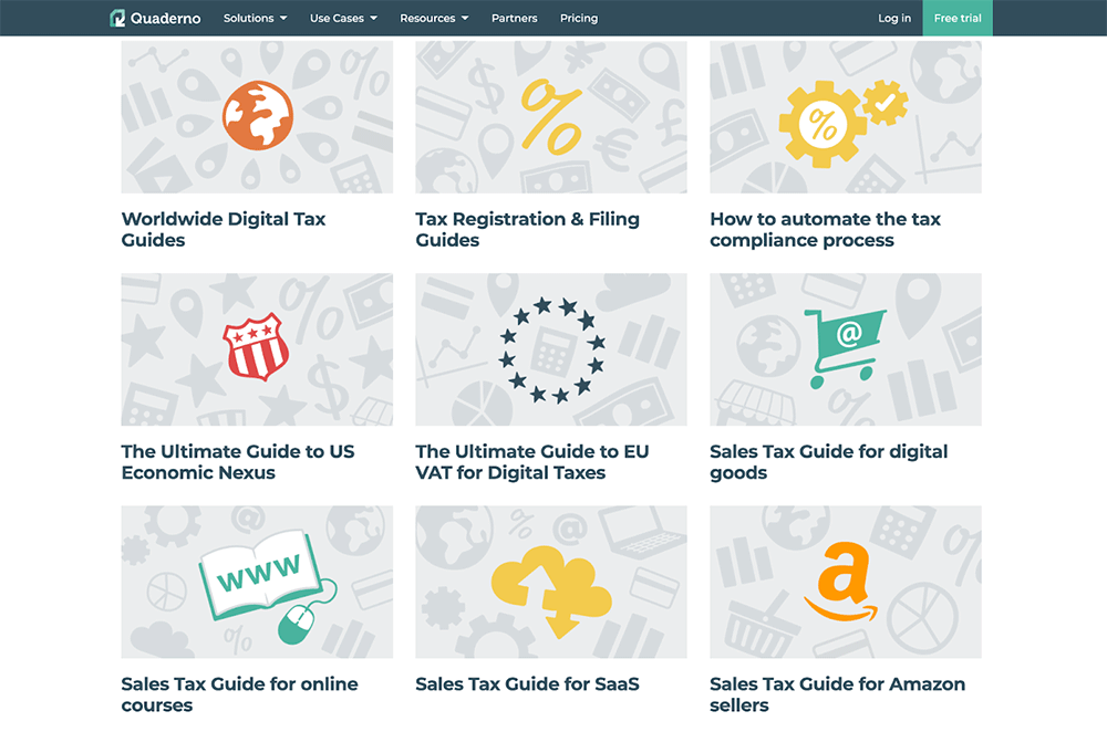 You can find a wide range of resources, including free tax guides to help you navigate the confusing world of taxes in Quaderno. In fact, it also has: