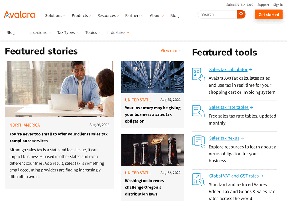 If you're looking for a tax compliance app that can scale with your growing dropshipping business, Avalara is an excellent option. It covers most industries, from retail and marketplaces to software and manufacturing. On their blog, you’ll find a large range of information, and you can filter your blog post search based on location, tax types, topics, and industries. Avalara simplifies sales and use tax, consumer use tax, and international compliance for small, mid-size, and large corporations. Some of the popular integrations include: