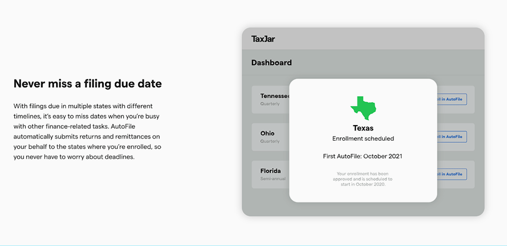 This cloud-based tax compliance software automates tax across all sales channels. It calculates nexus and sales tax for each location and notifies you when you're reaching tax nexus thresholds. TaxJar helps with timelines, reducing processing time and costs, and it minimizes human error. It also works with small and mid-size market businesses in retail, food and beverage, medical, and of course, dropshipping. Plus, it has a valuable blog and resources tab with helpful information on sales tax.