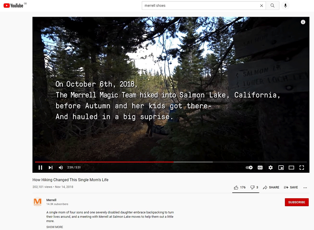 For example, the outdoor footwear company Merrell creates engaging video content by telling stories about its customers.