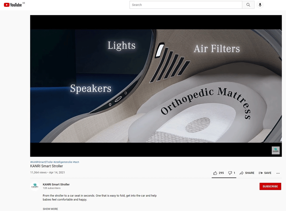 This demo video by KANRI showcases its Smart Stroller product. It shows every detail of the product and uses graphics to highlight its features.