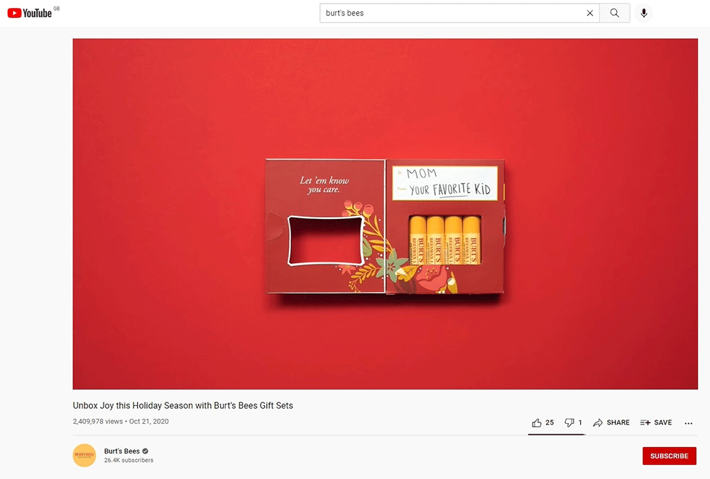 This example from Burt's Bees was released in October 2020, in the run-up to the holiday season. The video manages to invoke nostalgia and festive feelings in a super-short video.