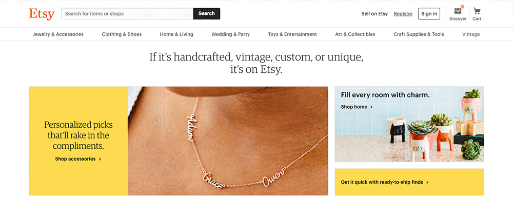 Etsy specializes in handmade and vintage goods, as well as craft supplies, but it’s actually branched ou into all sorts of categories in recent years. Yes, it’s limited as to what you can list on the network, but it’s always worth checking if your particular niche fits in – you might be surprised!