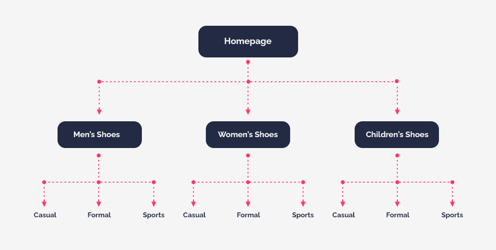 Imagine you run an online shoe store. Your site’s structure might look something like this: