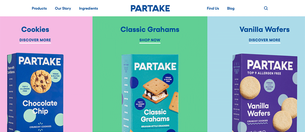 Partake Foods showcases their popular 5-in-1 Baking Mix on their homepage, making it the focal point for visitors. This strategic placement highlights their best product and entices visitors to learn more.