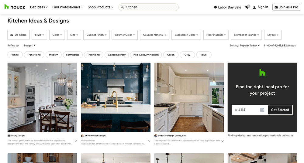 Houzz offers a personalized search experience for first-time shoppers by allowing them to select topics of interest. This ensures that visitors only see relevant results, enhancing their shopping experience.