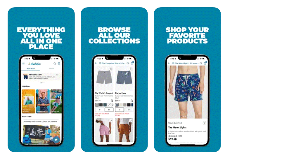 Chubbies excels in mobile optimization by using a minimalistic design that fits perfectly on small screens, combined with clear and clickable CTAs.