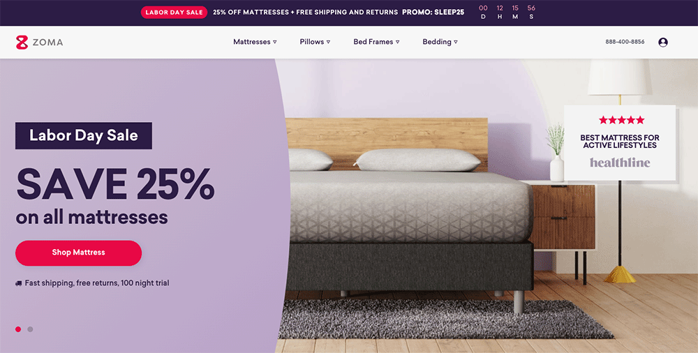 Zoma entices customers with a $150 discount, a specific end date, and a countdown timer, creating a compelling offer that drives conversions.