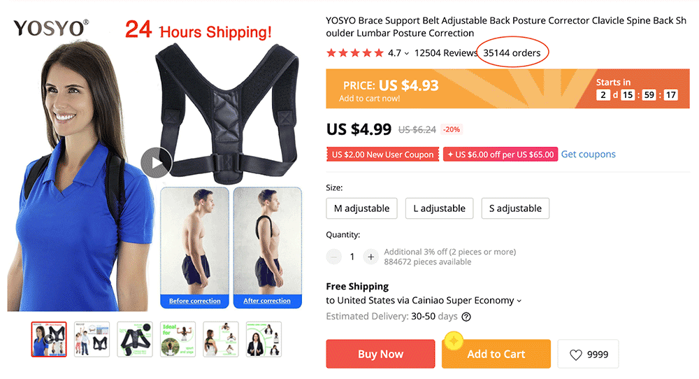 This posture corrector on AliExpress has been an extremely popular dropshipping product over the past couple of years, judging by the 35,144 orders (and that’s just from one supplier).