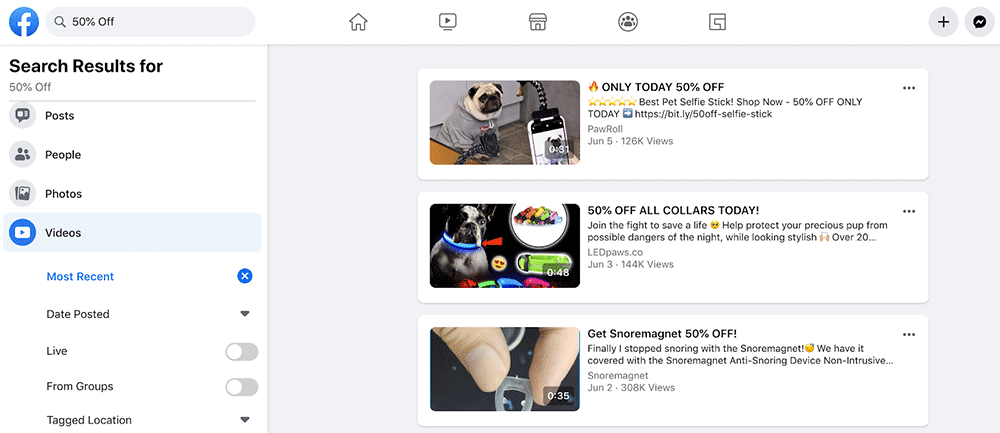 Simply type “free worldwide shipping” or “50% off” in the Facebook search bar, then on the left-hand side click “Videos”.