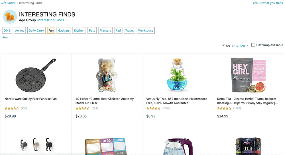 Amazon’s Gift Finder has an “Interesting” section, which is a goldmine for new and unusual products.