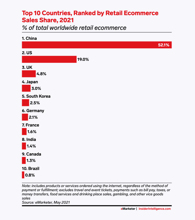 It’s no secret that China’s population is vast and its subsequent global market share HUGE. What you might not know is that China’s eCommerce makes up a whopping 52.1% of all retail eCommerce worldwide, with the US reaching distant second place at only 19%.