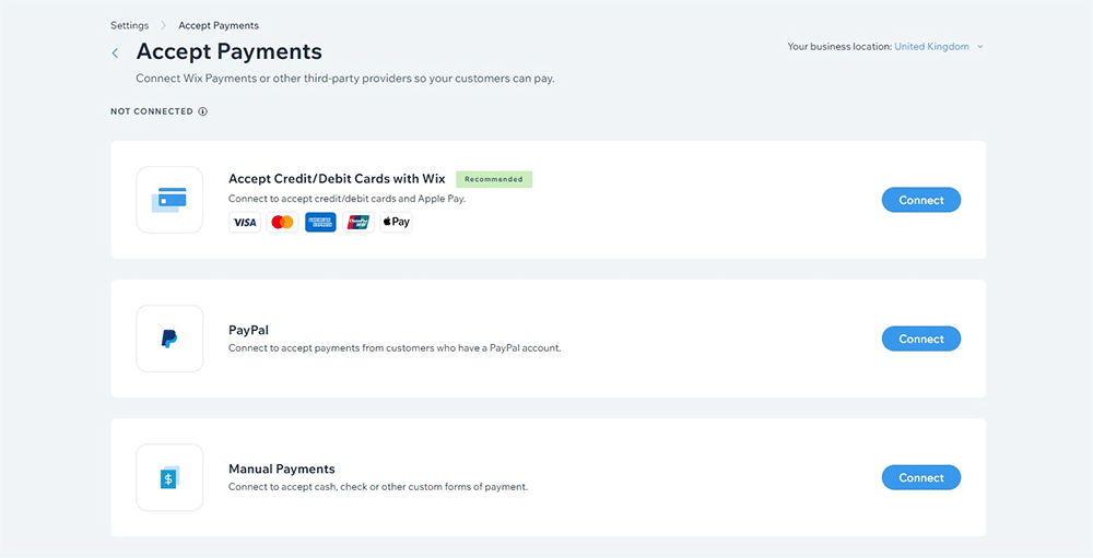You can find the payment options in the settings menu under the ‘Store Manager’ tab in the Wix dashboard.
